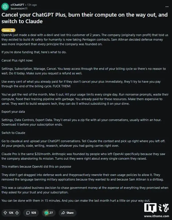 因此,用户选择了唯一能真正打击 OpenAI 的方式:用脚投票,停止付费。据 Tom's Guide 报道,“取消 ChatGPT(Cancel ChatGPT)”的运动正在蔓延,似乎已经影响到这家人工智能巨头的收入。当然,取消订阅的实际规模难以估量,可能只是在 Reddit 和 X 上发声的少数人,而绝大多数 ChatGPT 用户仍在正常使用,全然不知自己的数据可能会被战争部使用。