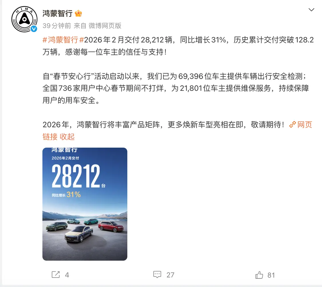 3月2日,鸿蒙智行宣布:2026年2交付28212辆,同比增长31%,历史累计交付突破128.2万辆。