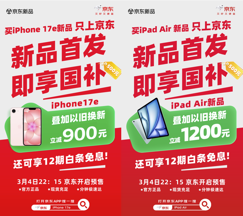 目前,iPhone 17e与2026款iPad Air已在京东开启预约通道。无论是想抢先体验A19芯片和磁吸充电的用户,还是期待用M4芯片提升生产力的创作者,现在打开京东App搜索“苹果新品福利”,即可锁定首批现货,叠加国家补贴与以旧换新福利,第一时间感受苹果生态的全新魅力。