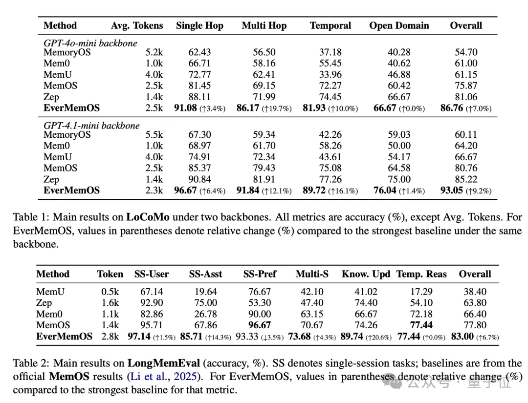 结果也很明显,EverMemOS大获全胜,全面超越现有记忆系统和全上下文模型。