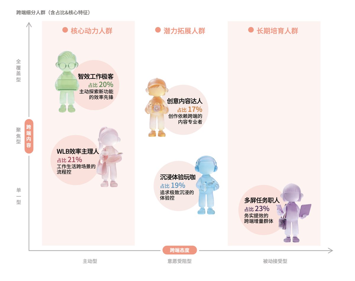然而,比硬件销量回暖更深刻的变革,是PC正在从"孤岛"走向"连接"。报告揭示了一个关键趋势:用户不再满足于"PC处理工作、手机消费内容"的割裂模式,而是期待任务与体验的无缝流转。数据显示,95%的智效工作极客群体近乎每日都会产生跨端操作行为,WLB效率主理人这一行为占比超85%,创意内容达人、沉浸体验玩咖、多屏任务职人等群体也对跨端操作提出更多需求。PC不再是移动互联网的备选终端,而是正在与移动生态深度融合,催生出一个全新的"跨端生态"。
