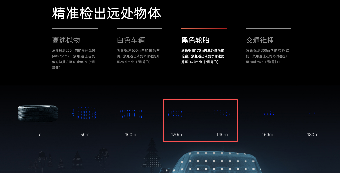 ● 超远距识别:可在120米外精准识别仅14厘米高的障碍物,122米外识别倒地轮胎,最远探测距离达162米,为高速行驶提供长达3秒的预警时间。