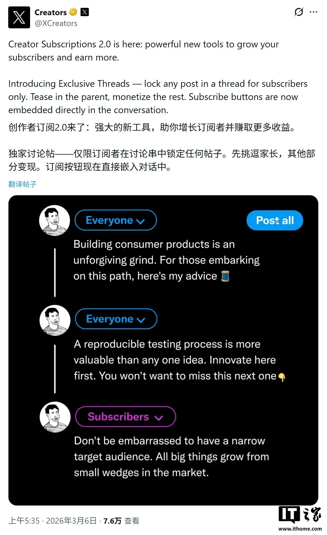 在本次服务升级中,最值得关注的是专属推文串(exclusive threads),创作者无需再将粉丝引流至外部网站或新闻简报,可以直接在 X 平台上实现内容变现。IT之家附上相关截图如下: