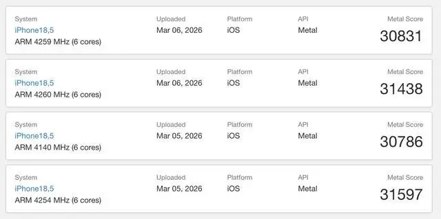 不过由于 GPU 核心被阉割,iPhone 17e 的 Metal 图形性能大约是 31000-31500 分,明显低于 iPhone 17 标准版的 37000 分。