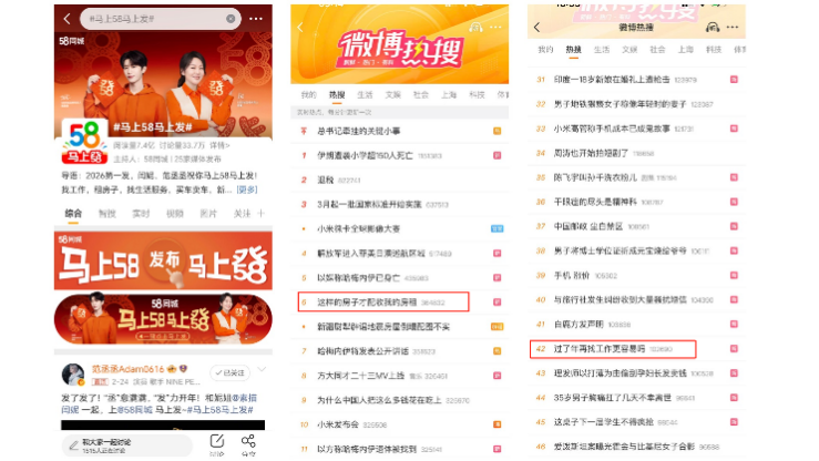 2月24日TVC上线后,#马上58马上发#等话题全面爆发,登上微博社会热搜榜,曝光达7.6亿+,互动量超百万。围绕工作、租房议题产生了#过了年再找工作更容易吗#、#这样的房子才配收我的房租#热门话题,登上微博热搜总榜第42名、第6名,吸引了大量的讨论和自来水。
