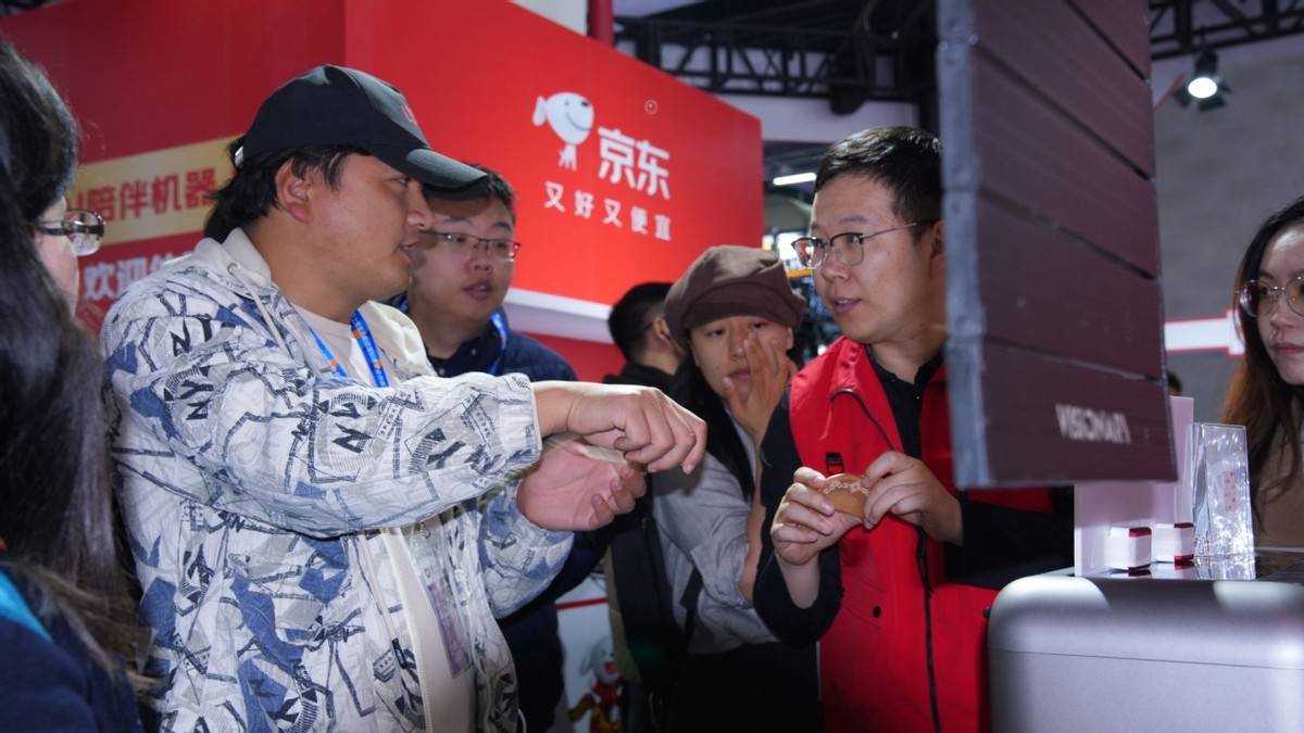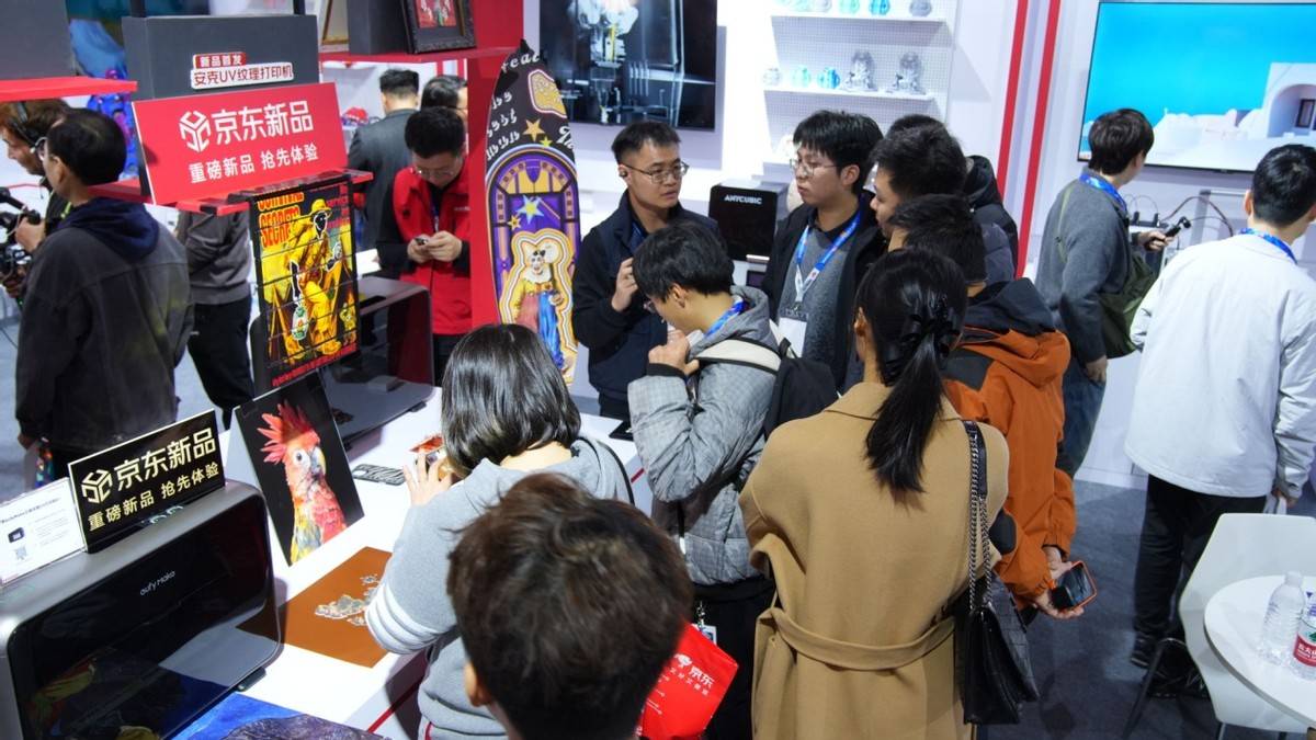 开展当天,京东展区内多个体验区内参观者络绎不绝。AI智能眼镜体验区等候试戴的参观者排起长队,有人刚刚戴上眼镜便向同伴描述眼前浮现的导航画面;3D打印展示区,拓竹、安克等品牌的设备现场运行,观众围在展台前观看模型从无到有的打印过程;安克eufyMake UV打印机作为全球首款消费级立体纹理打印机,展台前持续聚集着好奇的观众,工作人员演示将普通照片转化为浮雕作品的过程,引发阵阵低声惊叹。