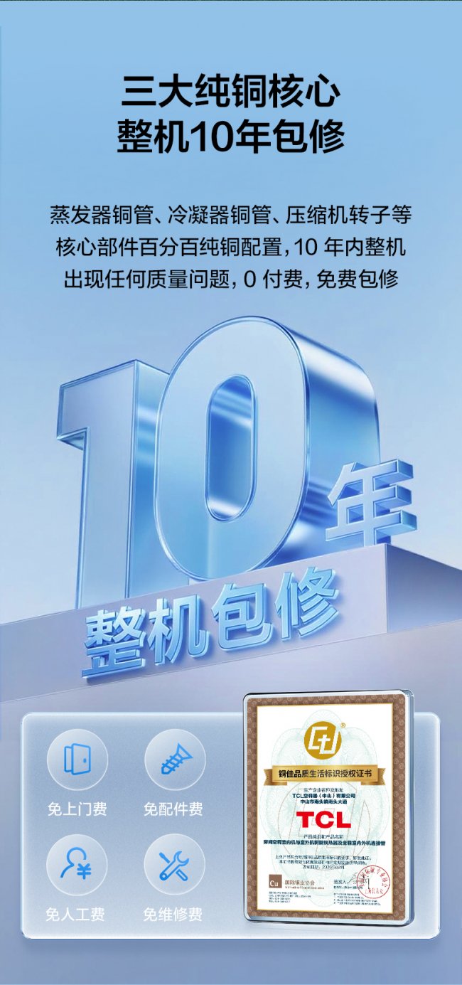 此外,针对用户使用空调日常维护的痛点,创新的抽拉式滤网专利结构让清洗变得极为便捷。此外,还提供整机10年包修服务,并承诺核心部件采用铜制真材实料,不仅是对消费者长期使用成本的有力保障,更是对自身匠心品质的无声宣言。