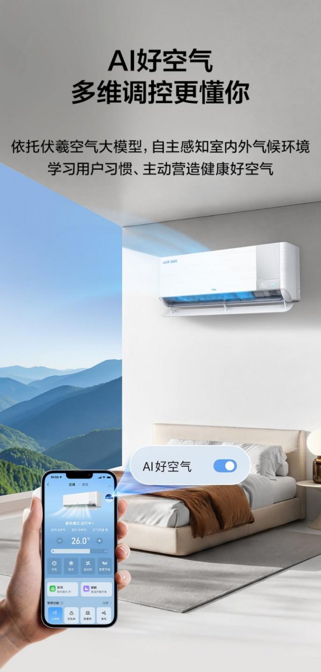 TCL小蓝翼·森林风AI健康新风空调搭载的智柔风6.0技术,通过不等距微孔大导风板与柔风叶片的协同作用,将集中的冷气流打散为柔和的气流,实现了冷风不直吹、风感柔和不刺肤的健康送风效果。这仅仅是基础,其核心的AI好空气功能依托于伏羲空气大模型,使空调具备了“思考”与“学习”的能力。
