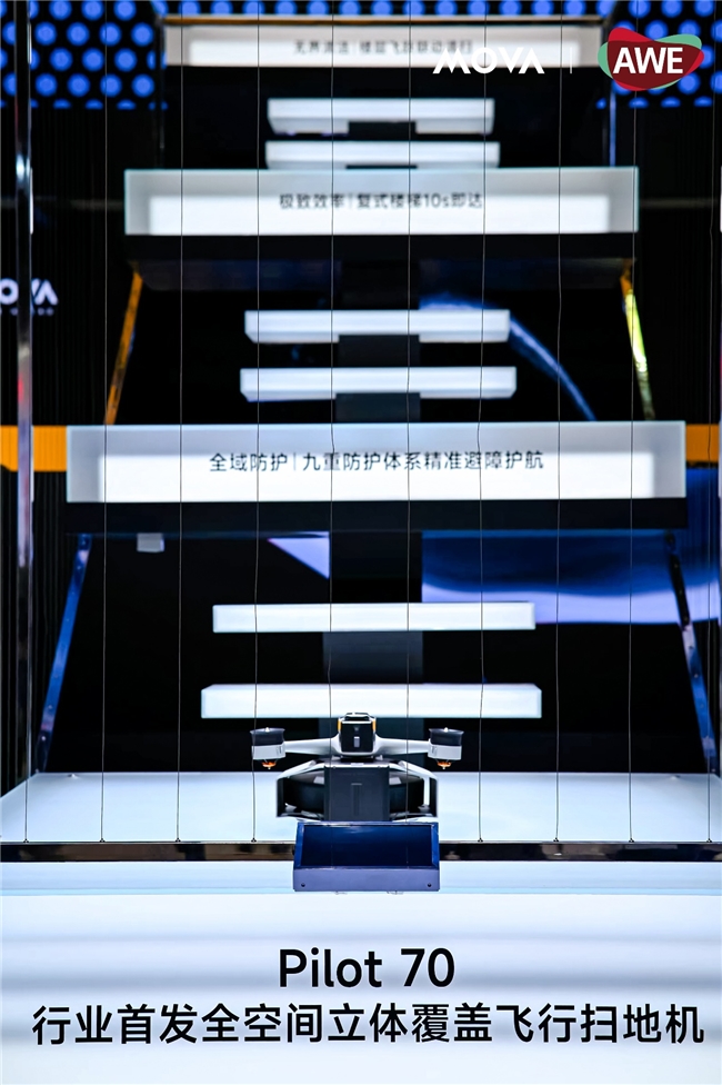 MOVA Pilot 70创新融合飞行模组,打造出全球首款无界飞行扫地机,将清洁维度从平面二维拓展至三维全域,实现对复式玻璃顶等高空区域的自动化覆盖。