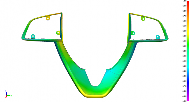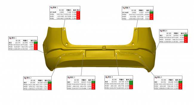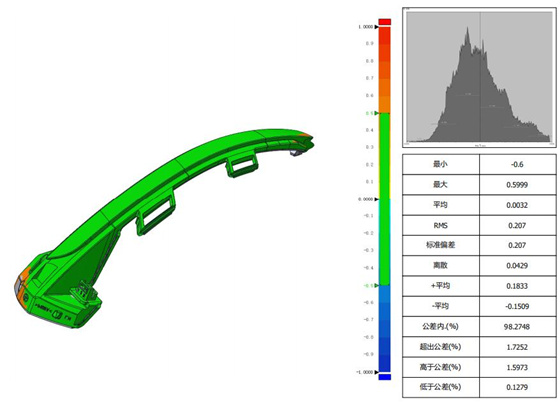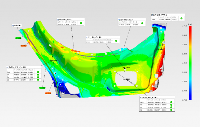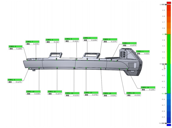 基于3D扫描数模导入检测软件,可实现全尺寸检测,且能够快速测量孔间距等数值,色谱图可以直观显示加工的形面偏差,一目了然。