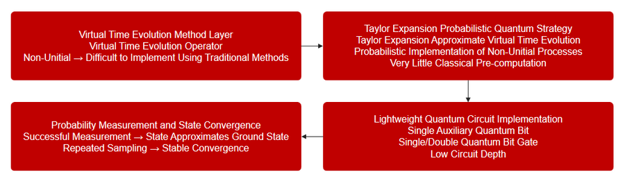 然而,虚时间演化算符本身是非幺正的,这与量子计算机只能自然实现幺正演化的物理约束形成了根本冲突。已有研究通常依赖复杂的经典预处理,例如变分优化、辅助子空间构造或多层参数搜索,这不仅显著增加了算法实现成本,也削弱了量子算法本身的优势。在这一背景下,微算法科技从算法基本形式出发,重新审视了虚时间演化在量子电路中的实现方式,提出了一种基于泰勒展开与概率测量机制的全新量子算法框架。