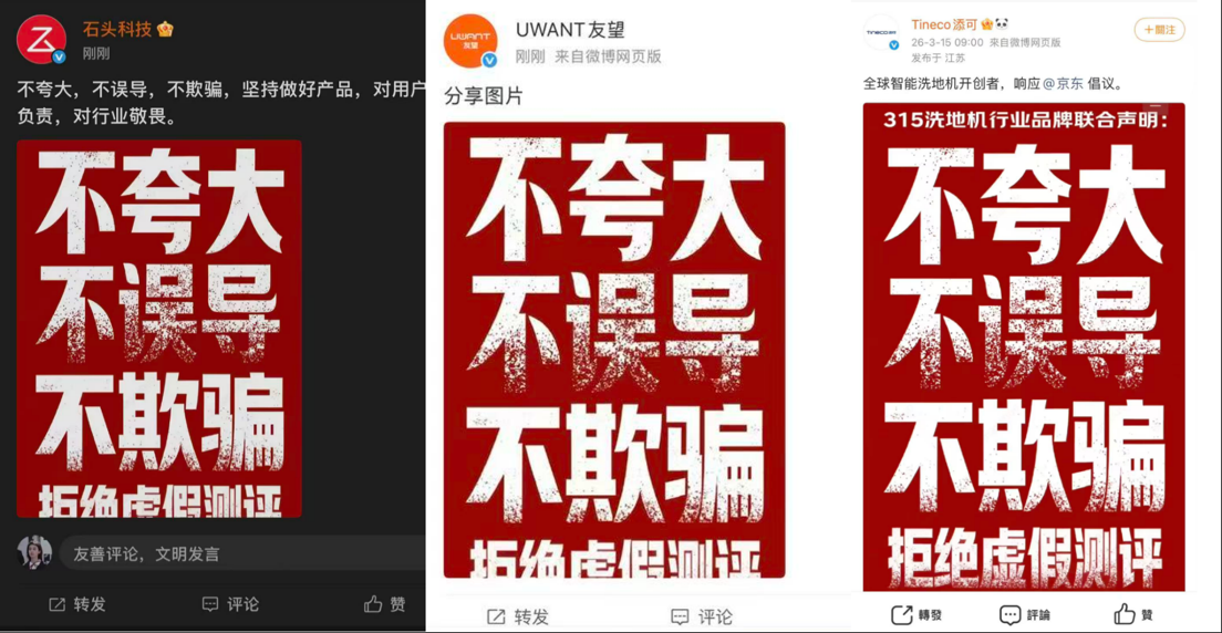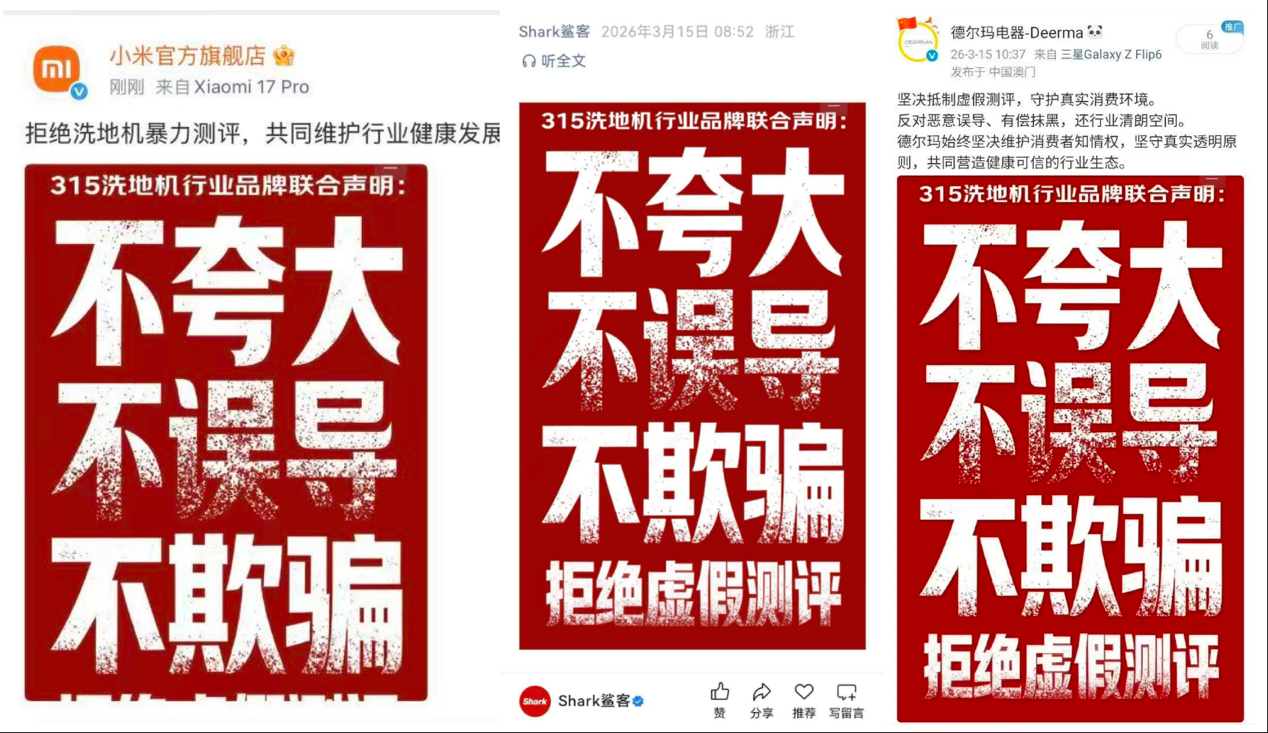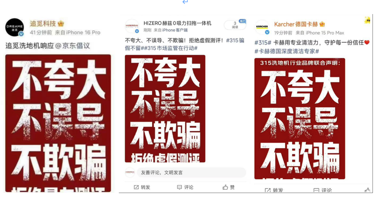 事实上,在近日的2026年AWE展会期间,京东就已联合云鲸、添可、追觅、uwant等多家洗地机品牌,在现场揭穿部分直播机构通过“技术处理”制造性能假象的操作方式,共同发声抵制虚假测评对行业生态的侵蚀。多位品牌负责人更是隔空怒斥虚假直播间。云鲸品牌负责人当场直言:“我们两三年研发出的科技成果,被这些虚假直播间用十几秒就‘否定’了,这不仅是对品牌投入的不尊重,更是在误导消费者。如果今天不站出来发声,消费者就可能一直被蒙在鼓里。” 还有品牌负责人表示,一些直播间会通过人为干预产品结构、堵塞吸污口等方式制造性能下滑假象,这种做法根本不是客观测评,而是在刻意“变魔术”。