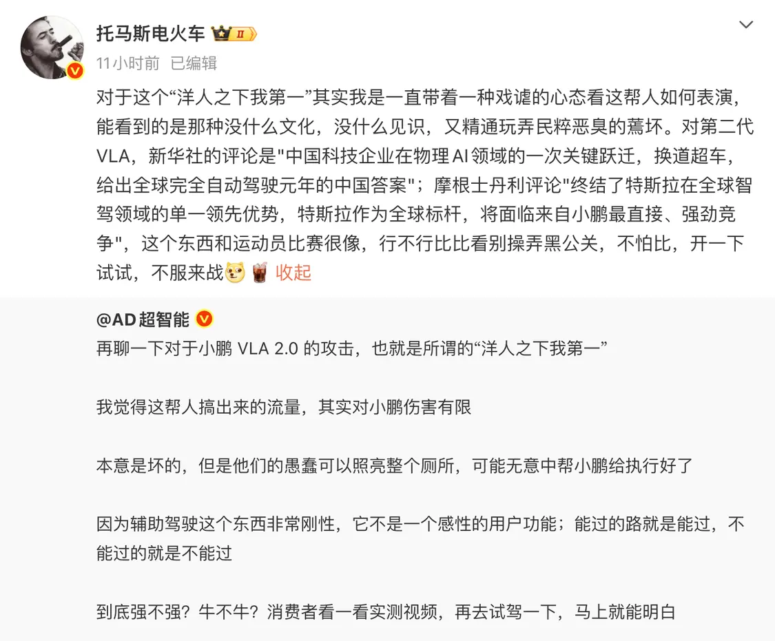 据了解,“洋人之下我第一”近日成为车圈热议梗,源于小鹏汽车CEO何小鹏在VLA 2.0技术发布中的言论被断章取义。