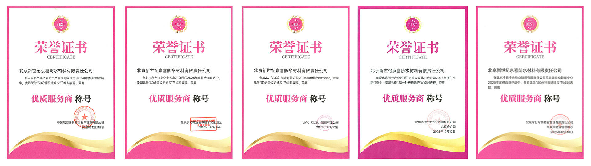 主动破解行业痛点、践行高效响应的背后,是京喜防水33年沉淀的扎实技术与硬核实力。作为国家高新技术企业,京喜防水拥有150多项已授权专利及商标,核心产品与施工技术优于行业标准,行业竞争力突出;连续四年斩获防水行业权威奖项“金禹奖”,并斩获“全国建筑建材行业优秀民营科技企业”“中央企业集采供应链百强企业”等多项殊荣,专业实力得到行业与市场的双重认证。同时,京喜防水长期为中国中铁、中国铁建、中国能建等国家级龙头企业提供系统性防水解决方案,服务案例覆盖故宫博物院、大兴国际机场、无锡地铁等众多重点工程,以卓越的工程品质与响应能力,筑牢行业标杆形象。