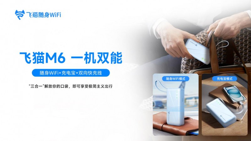 今日,飞猫新品M6 新国标认证充电宝随身 WiFi正式开售。产品以一体化创新设计,融合随身 WiFi、充电宝、双向快充数据线三大核心功能,为用户提供安全、高效、便捷的移动网络服务与充电解决方案,重新定义移动生产力与娱乐体验。