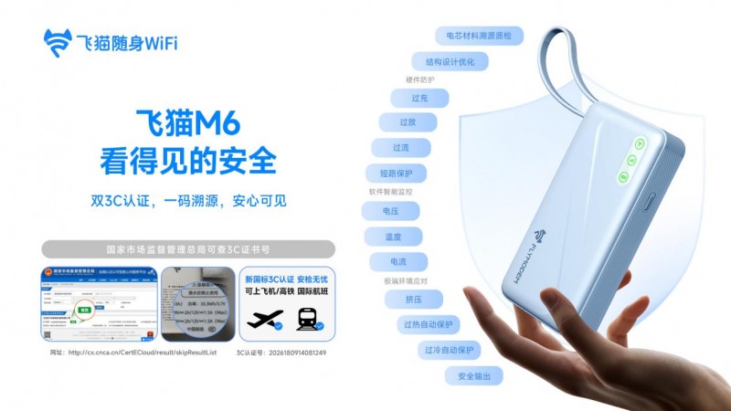飞猫 M6严格通过3C 认证,支持国家市场监督管理总局平台扫码溯源,每台设备的认证信息、生产流程均可查询,安全责任可追溯,从源头保障用户使用安全。同时搭载多重安全防护系统,覆盖过压、过流、过热、过冷、短路、挤压等极端场景,全方位守护充电与连网安全。此外,产品符合航空安全标准,可随身携带登机,满足高频差旅用户的出行需求。