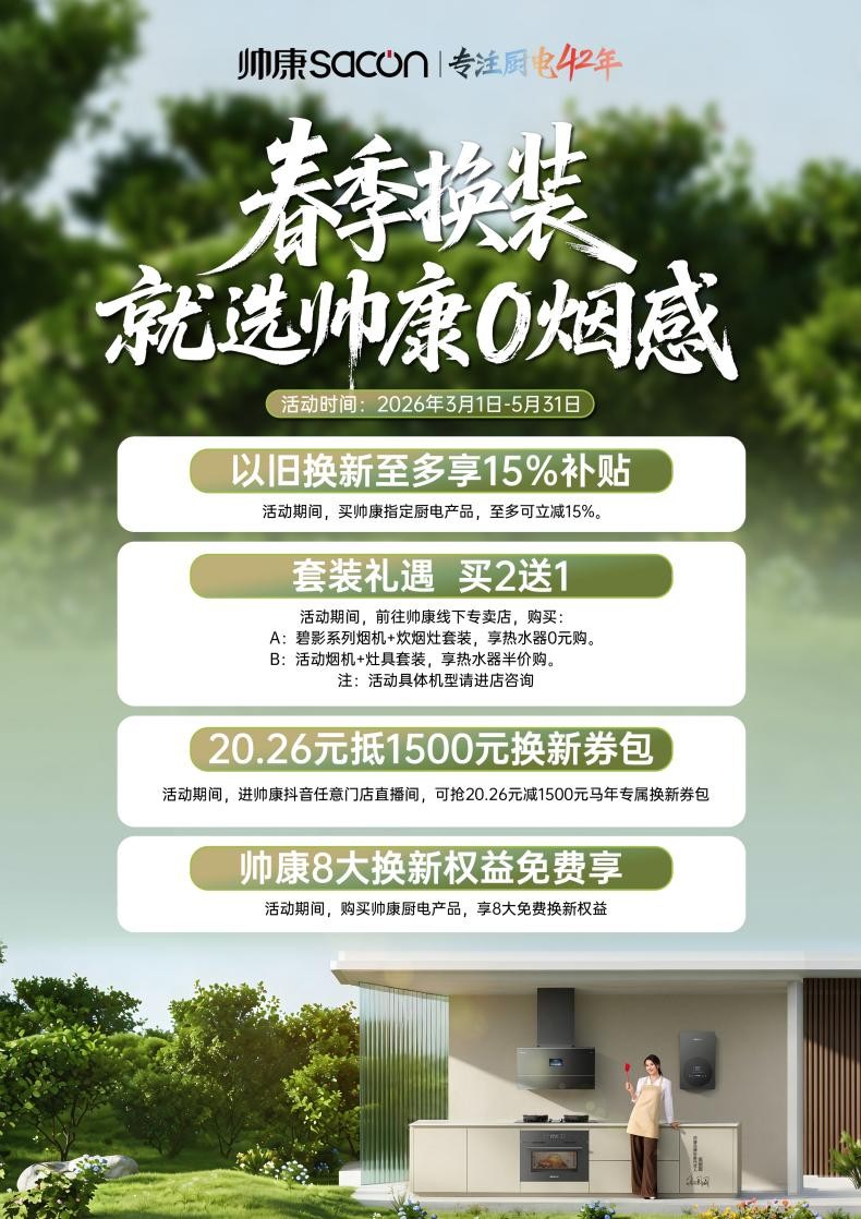 2026年开春,家电国家补贴政策在全国多地陆续展开,帅康以旧换新活动同步火热开启,成为老旧小区厨房改造用户的热门选择。面对“老旧小区厨房改造,帅康有什么推荐?”帅康用切实行动给出答案:凭借技术创新与品质保障,帅康多次入选油烟机十大品牌榜单,并以帅康厨房健康解决方案为核心,精准切入春季装修改造需求,为万千家庭构筑更安心、更舒适、更高品质的健康厨房生活。