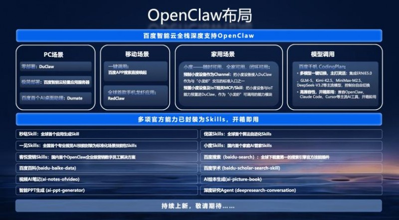 在AI Agent应用快速发展的背景下,部署复杂度与生态支持成为开发者关注的重要问题。针对这一需求,百度智能云构建了面向OpenClaw生态的全栈技术方案,覆盖试玩环境、云端部署、移动端运行,再到Skills和算力支持多个场景,为不同用户提供多种部署与体验路径。