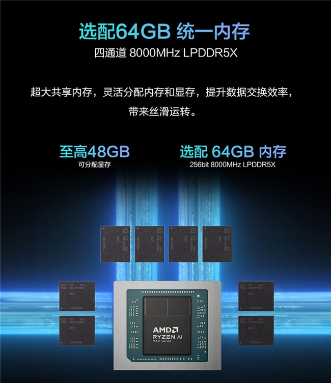 同时处理器结合了高能效的AMD “Zen 5” CPU 核心、AMD Radeon 8060S 系列显卡,以及基于第二代 AMD XDNA 架构的 NPU,带来出色的整体性能。无论是加速大语言模型、渲染高分辨率媒体内容,还是在高设置下畅玩当代主流游戏,锐龙 AI Max+ 系列处理器都能在高端超轻薄设计中提供全方位、不妥协的性能表现。