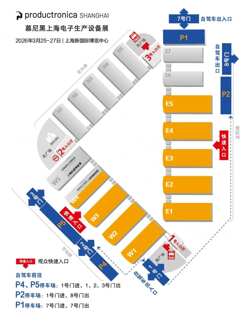 1. 乘坐地铁2号线,至龙阳路站,从9号口出地铁站,步行至1号登记大厅(南大厅),可直接从W1馆或E1馆开始参观慕尼黑上海电子生产设备展;
