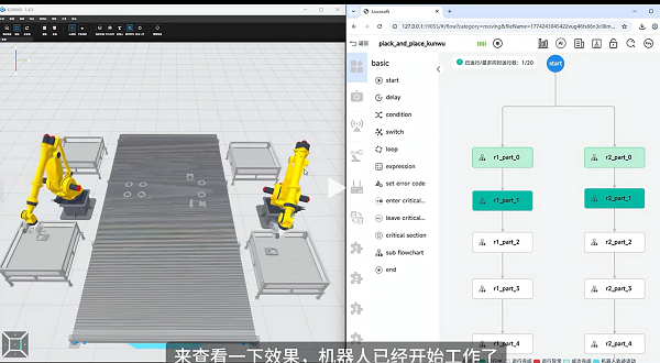 例如,你只需把场景信息和要实现的功能告诉它:“使用坤吾低代码平台,实现场景中的机器人将平台上的零件放入料框中。”