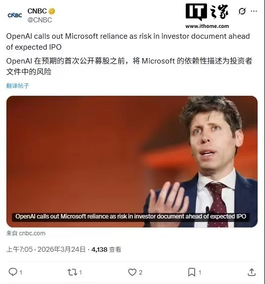 3 月 24 日消息,据 CNBC 今日报道,OpenAI 发布了一份形似 IPO 招股说明书的文件,坦诚“公司与微软的紧密关系可能构成潜在业务风险”,因为这家软件巨头承担了“我们融资与计算资源中的相当大一部分”。