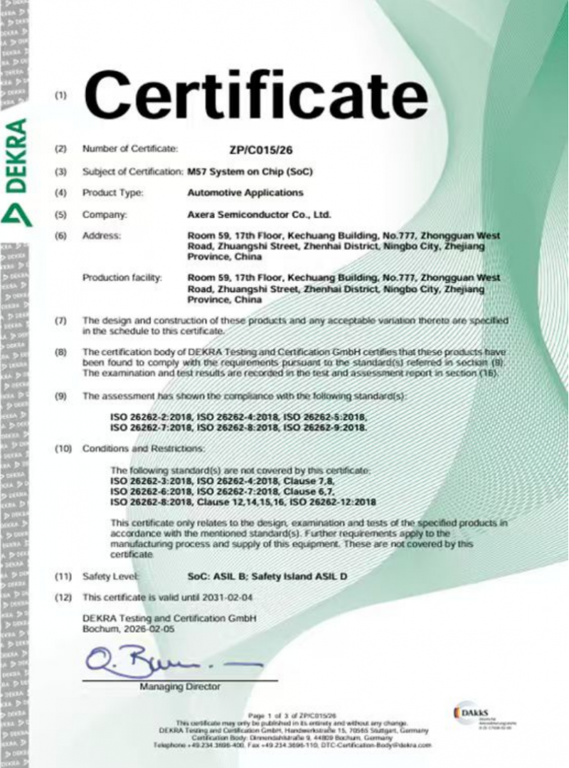 爱芯元智联合创始人兼研发负责人王远表示:“芯片行业需要长期主义,我们选择从L2级辅助驾驶赛道切入,既要服务中国车企的智能化升级,也要助力全球市场合规落地。M57是现在L2级辅助驾驶的最优解。凭借优异的能效比与成本控制,M57为主流车型L2功能标配创造了可行路径,配合完备的软硬件支持,客户可快速完成方案升级与量产导入。此次为爱芯元智M57芯片颁发ISO 26262 ASIL B/D认证,是DEKRA德凯以其专业、严谨的评估流程,助力中国芯片企业对标国际安全标准、提升产品竞争力的典范。”