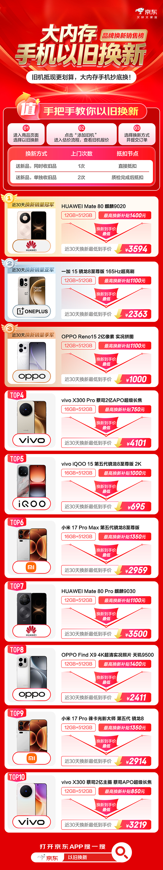 此外,京东推出大内存手机以旧换新销售榜,纠结买哪款手机的消费者可以跟着该榜单下单,一次性了解近30天换新销量TOP10的手机产品,享低价换新。其中,华为Mate 80斩获近30天换新销量冠军,12GB+512GB近30天换新最低到手价3594元;一加 15斩获近30天换新销量亚军,12GB+512GB近30天换新最低到手价2363元;OPPO Reno15斩获近30天换新销量季军,12GB+512GB近30天换新最低到手价1000元。
