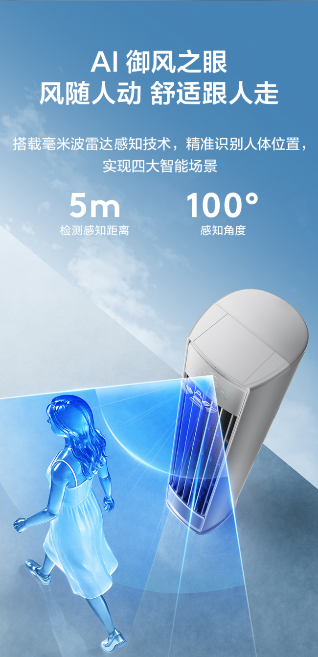 TCL小蓝翼·全域风Pro AI健康舒适空调搭载AI御风之眼,依托毫米波雷达感知技术,精准识别人体位置、移动轨迹,轻松实现四大智能场景——风随人动、人近风柔/人远风强、无人节能。