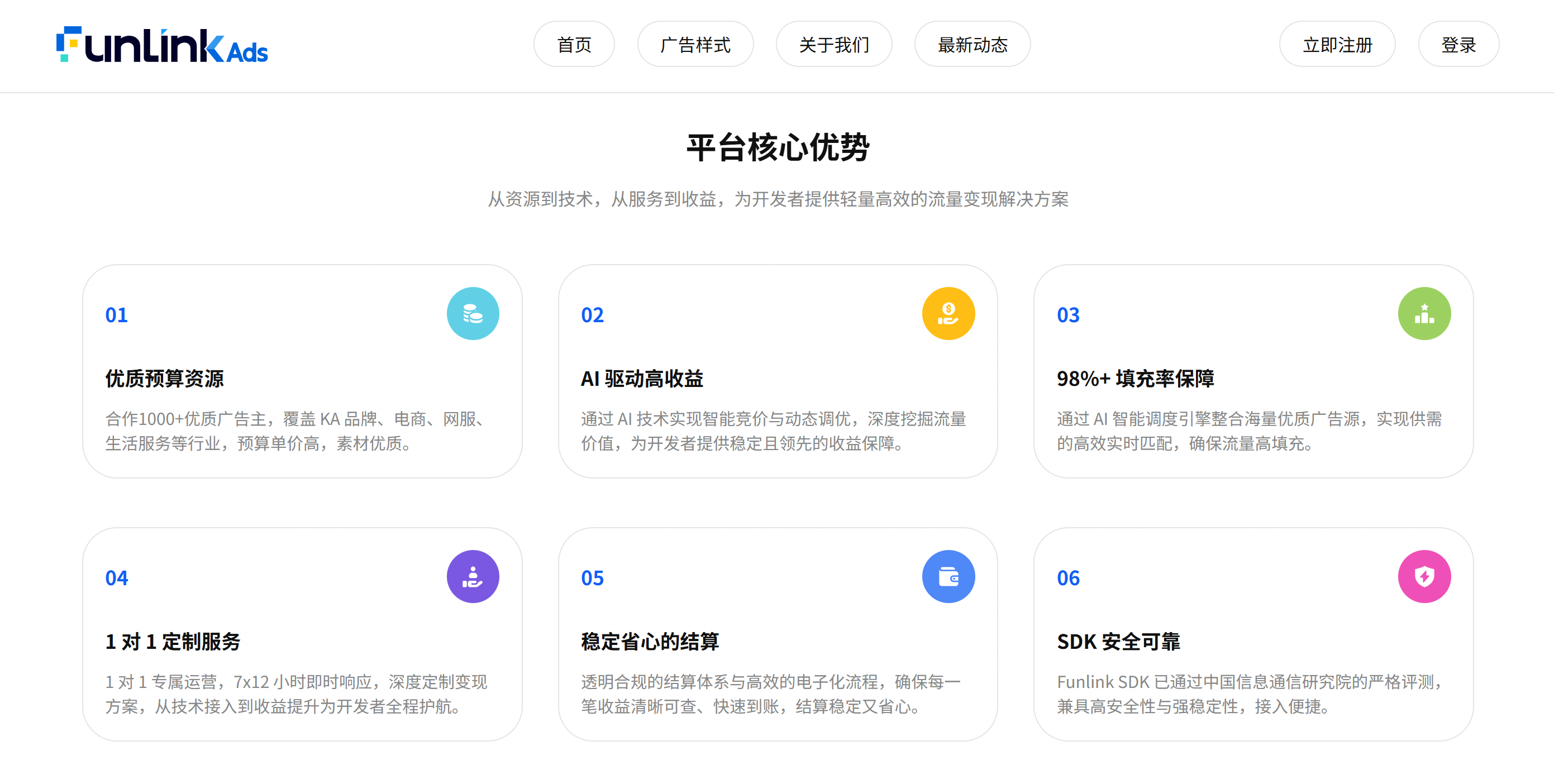 Funlink 轻量高效流量变现平台,聚焦破解开发者变现效率低、广告预算单一的核心痛点,以优质广告资源、自研技术引擎、定制化服务为三大核心支撑,助力开发者实现收益最大化与长效增长。