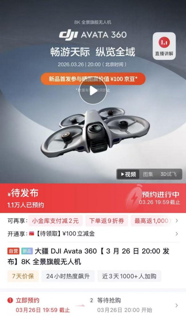 近日,大疆正式官宣旗下首款8K全景旗舰无人机——DJI Avata 360将于北京时间3月26日20:00全球发布。目前京东已同步开启预约通道,即日起至3月26日20:00,打开京东APP搜索“大疆 Avata 360”立即预约,参与晒单更有机会赢京豆,福利叠加,首发入手更划算!