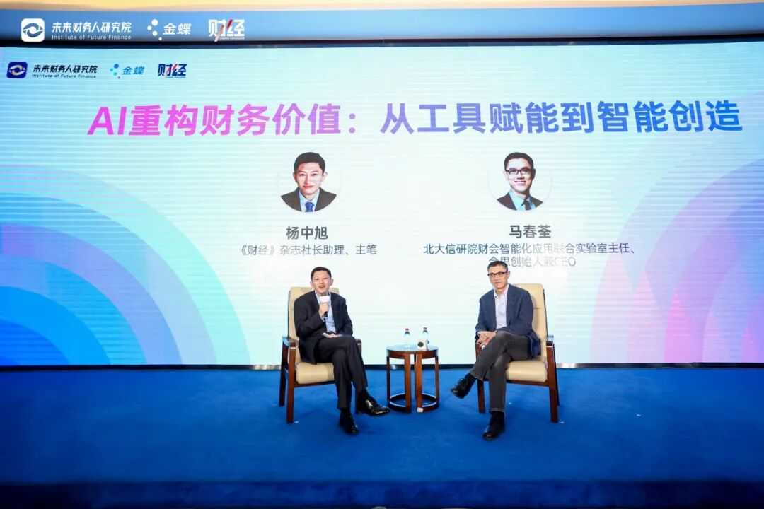 大会现场,北大信研院财会智能化应用联合实验室主任、合思创始人兼CEO马春荃与《财经》杂志社长助理、主笔杨中旭展开以「AI重构财务价值,从工具赋能到智能创造」为主题的深度对话。