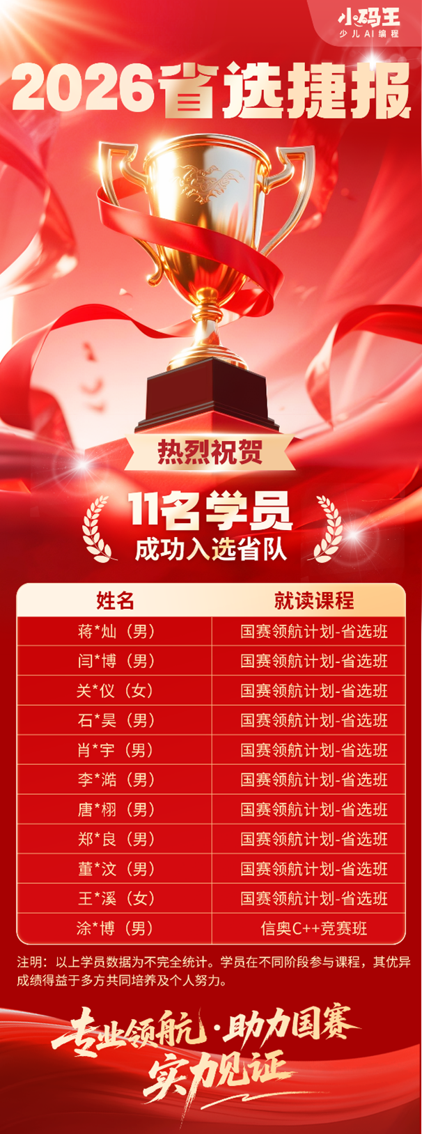 近日,随着2026年NOI各省省选相继落幕,截止当前,全国各省省选名单已经陆续正式发布,小码王再传捷报——11名学员凭借硬核实力成功入选省队,出征2026年全国青少年信息学奥林匹克竞赛(NOI)国赛,向金牌发起冲击!