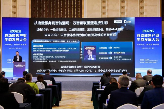 在AI浪潮重塑通信产业的关键节点,3月26日,移动转售产业生态发展大会在遵义召开。联想集团副总裁、联想懂的通信CEO王帅博士在会上发表《从万类智联到万智互联——全球虚商的分钟、比特、Token之旅》主题演讲,提出当前正处于“万类智联”进入“万智互联”的关键拐点,“智”从能力、工具、功能,正在成为世界主体,下一代连接网络,本质上是一张亿兆级智能体协同网络。