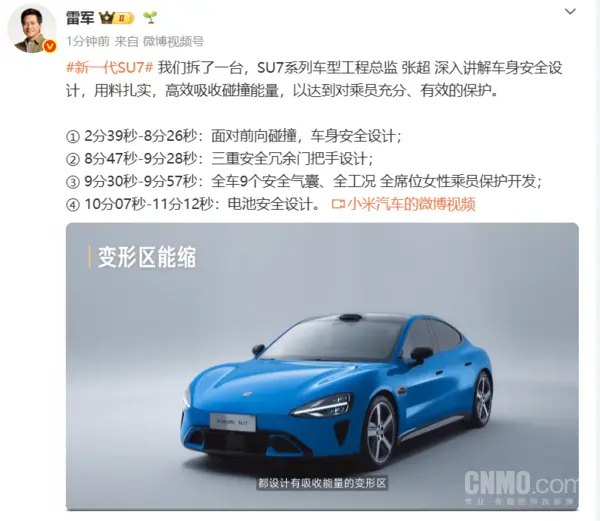 3月31日,小米创办人雷军发布新一代小米SU7拆解视频。视频中,SU7系列车型工程总监张超深入讲解了该车的车身安全设计。
