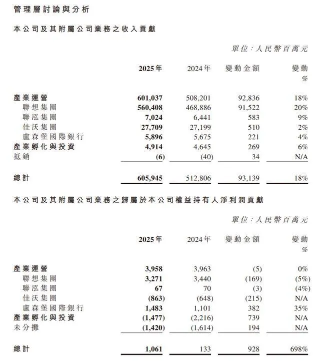 联想控股表示,2025 年是十四五的收官之年,在这一年联想控股收入同比增长 18%,一举突破六千亿元大关,创下历史新高,利润也实现同比大幅回升。