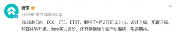 4月1日,蔚来汽车官方宣布,蔚来ES6、EC6、ET5、ET5T(网友称5566系列)将于4月2日迎来2026款升级。官方以“设计升级、配置升级、智驾体验升级,还有特别版车型同步揭晓”简短预告,但结合此前披露的信息,新款车型将在智能感知、舒适配置、座舱交互等多维度全面升级,全系标配“小蓝灯”(辅助驾驶状态指示灯),蔚来ES6/EC6还将首次搭载主驾零重力座椅。