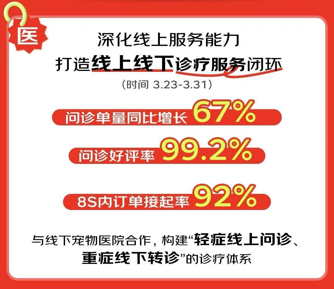 针对“看病乱”的就医痛点,京东健康依托京东健康宠物医院,由专业执证宠医提供7X24小时在线诊疗服务,高效解决宠主日常轻症咨询需求,并联动全国超11000家正规线下宠物医院,推行“轻症线上问诊、重症线下转诊”的诊疗体系,为宠主提供规范就医路径,实现医疗资源的高效利用。数据显示,超品日期间,宠物医院问诊单量同比增长67%,问诊好评率达99.2%,8秒内订单接起率92%。