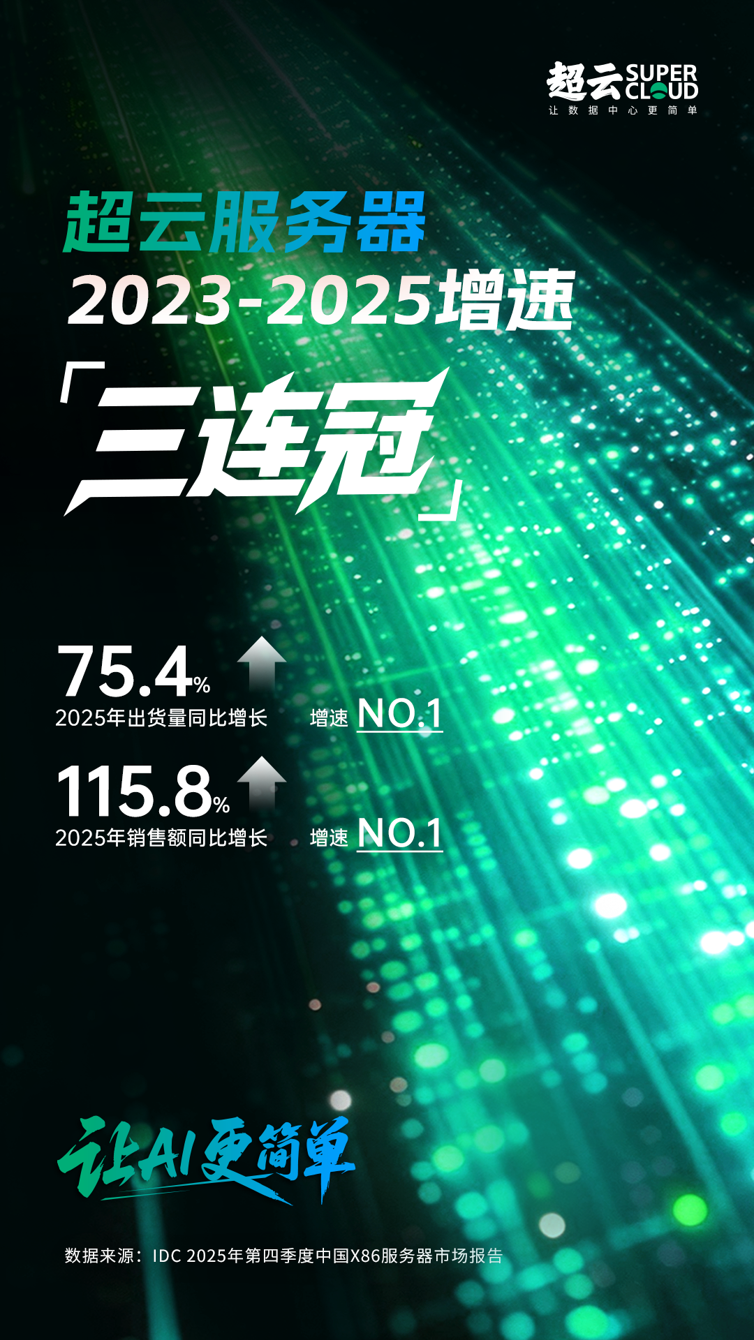 在行业变革的浪潮中,超云展现出强劲的增长韧性。自2023年首次入榜以来,超云连续三年蝉联年度增速*,2025年更以115.8%的销售额增速、75.4%的出货量增速实现"全面领跑",成为IDC报告中增速最高的厂商。