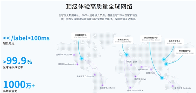 全球网络覆盖能力上,环信在全球部署中国北京、新加坡、美国、德国等多个数据中心,覆盖240多个国家和地区,拥有近千个终端网络加速节点。依托智能路由技术,实现端到端延迟低于100ms,全球连接成功率超过99.95%;针对跨境企业需求,支持服务区域隔离,确保用户隐私数据不跨境,同时通过直连、AWSGA、SDRTN三路径冗余,实现运营商网络故障自动切换,保障全球范围内的稳定通信。
