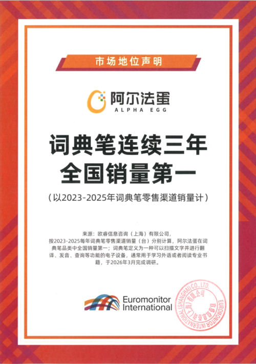 这些年,词典笔渐渐走进千家万户,成为不少孩子学习的得力帮手。而在这一品类中,淘云科技旗下的阿尔法蛋词典笔表现格外亮眼。日前,权威知名机构欧睿咨询发布知名声明,阿尔法蛋词典笔以2025年零售渠道销量统计,第三次荣获全国词典笔销量第一。