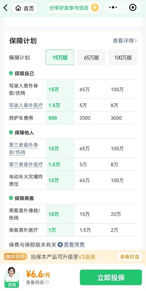 在高便捷性和高适配性的基础上,腾讯微保两轮电动车意外险的保障做到了全场景覆盖:从驾驶人、乘客到第三者,意外身故/伤残、意外医疗、救护车费用全覆盖,更包含电动车火灾爆炸责任,15万/65万/100万三档保额灵活可选;所有医疗类责任统一90%赔付,仅扣100元免赔额,火灾财产损失也按90%赔付,低门槛、高保障,日常通勤、带娃出行等都能兜底。15万版本的月缴保费只需 6.6 元,18-65周岁的驾驶人都能购买,次日即可生效。