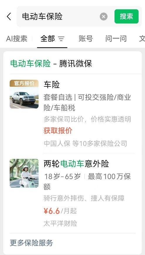 目前市场上,电动两轮车保险已经可以直接在微信里购买,微信直接搜索“电动车保险”即可投保。这个两轮车保险是腾讯微保联合太平洋财险推出的两轮电动车意外险,精准适配绿牌电动车主的保障需求,成为日常通勤、骑行接娃、市区代步等骑行场景下的优选方案。作为国内头部互联网保险平台,腾讯微保是腾讯官方保险代理平台,持牌金融机构,稳居行业第一梯队,累计服务超1亿用户,是亿万家庭信赖的“国民级”保险入口。