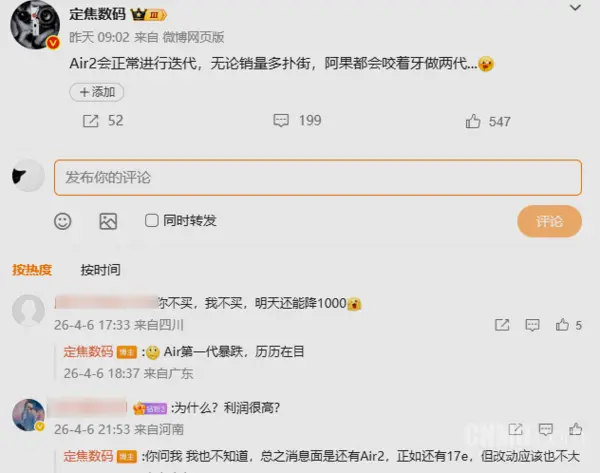 去年9月发布的iPhone Air,凭借5.6毫米的极致轻薄机身成为苹果史上最薄的手机,国行起售价为7999元。不过,这款产品自上市以来销量表现远低于预期。根据相关爆料,iPhone Air的首周激活量仅为约5万台,累计销量不及苹果预期的三分之一。知名分析师郭明錤也曾指出该机型需求疲软,导致供应链大幅缩减产能,预计到2026年一季度产能削减超过80%。目前,该机型在市场上的价格已出现显著下跌。