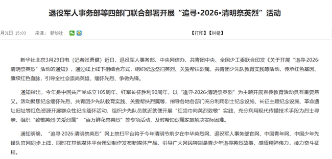 清明节追思先辈先烈一直是中华民族的传统。今年是中国共产党成立105周年、红军长征胜利90周年,在今年清明节来临前,退役军人事务部、中央网信办、共青团中央、全国少工委联合印发《关于开展“追寻·2026·清明祭英烈”活动的通知》(以下简称《通知》),倡导社会各界通过线上线下相结合方式,纪念祭扫英烈、关爱帮扶烈属,传承红色基因、赓续红色血脉。
