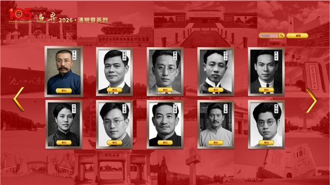 [祭奠英烈]模块同样也是该平台的核心板块,同样也采用了动画、3D、数字人等技术。与[敬献花篮]模块不同的是,该板块提供了英烈的信息查询和个性化祭奠功能,用户可以根据个人倾向,有意向选择祭扫对象。