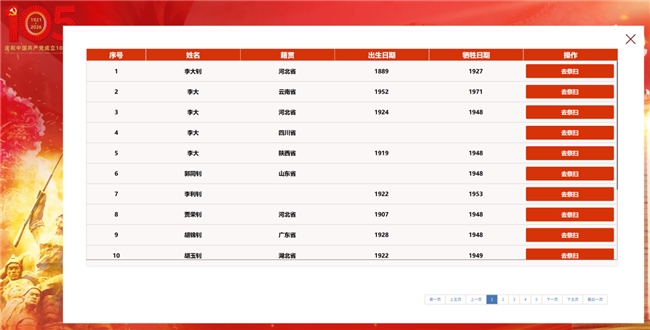 革命英烈的相关个人信息,然后点击“去祭扫”,即可去到该先烈墓碑前进行“云献花”、“云送花圈”、“云鞠躬”等,查看了解英烈们的生平事迹、牺牲经过、荣誉表彰等详细内容以及留言表达自己对英烈的追思等。另一方面,用户也可以直接在[祭奠英烈]页面通过左右滑动浏览的方式,选择个人倾向祭扫的革命英烈,然后进行“云献花”、“云送花圈”、“云鞠躬”、浏览英烈生平事迹、留言表达追思等仪式。