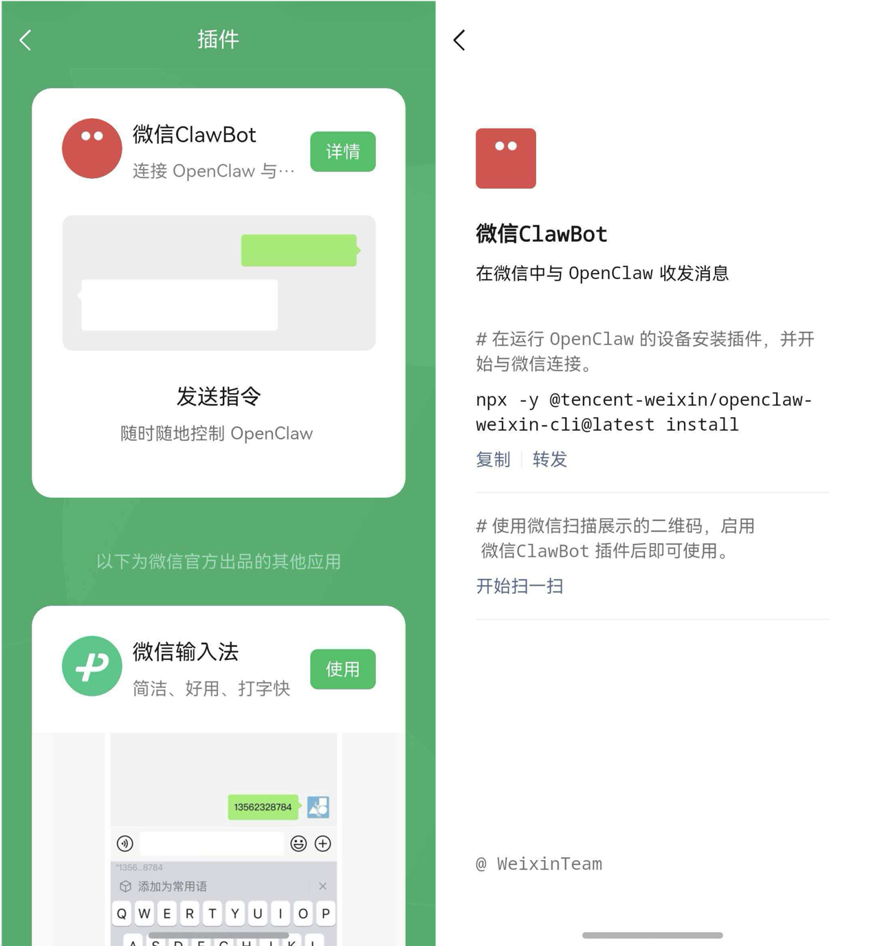 【设置方法】:在“我”-“设置”-“插件”里找到“微信ClawBot”,安装插件或扫码连接OpenClaw之后,就能在微信里与OpenClaw直接对话,指挥AI帮你干活,微信聊天框从此成为你的专属“AI操作台”。
