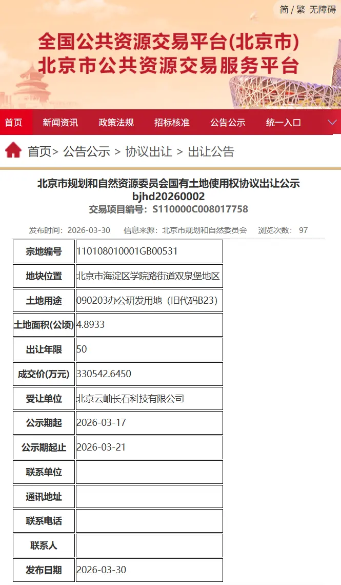 4 月 8 日消息,字节跳动全资控股的北京云岫长石科技有限公司,于 3 月底成功受让位于海淀区学院路街道双泉堡地区的一宗科研用地,成交价约 33.05 亿元。