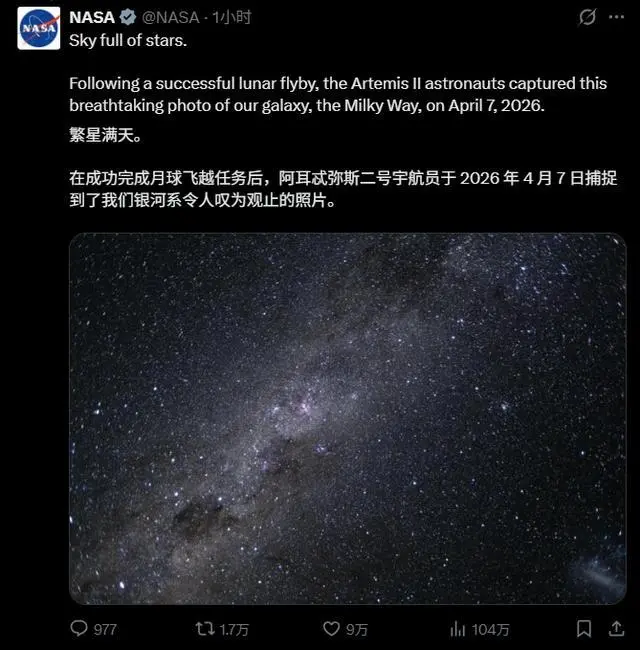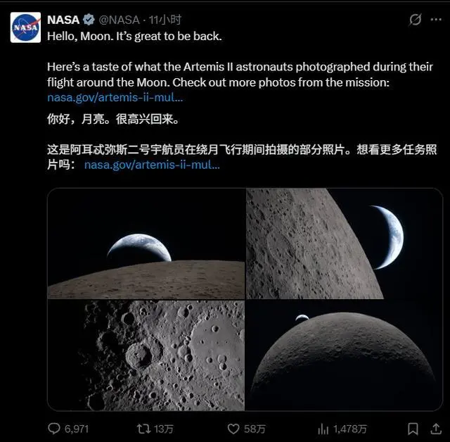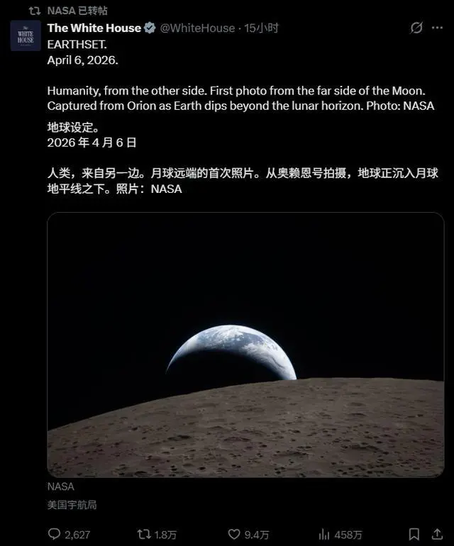 4 月 8 日消息,据美国航空航天局 NASA 消息,执行美国“阿耳忒弥斯 2 号”载人绕月飞行任务的“猎户座”飞船 7 日开始返回地球的旅程。